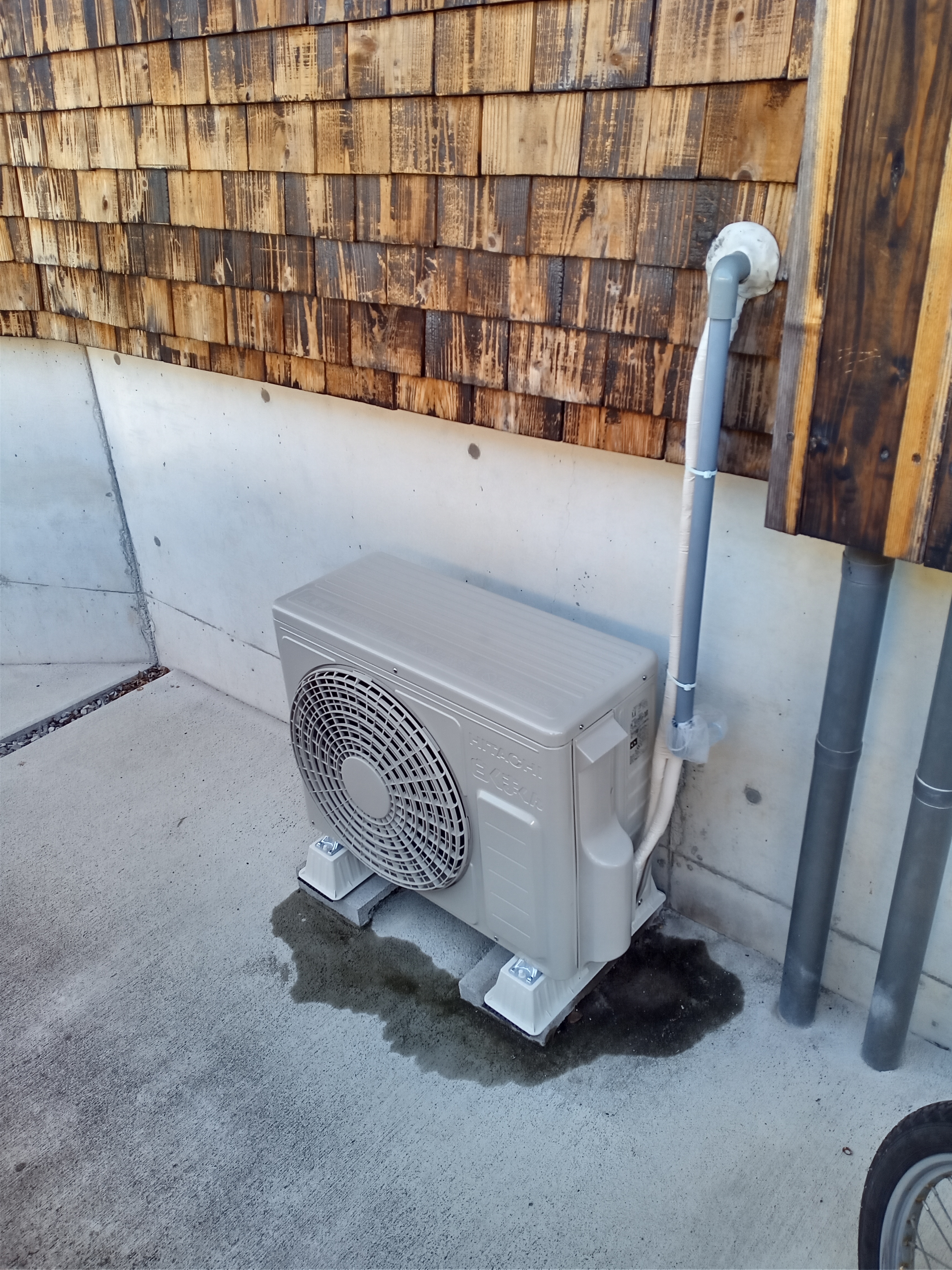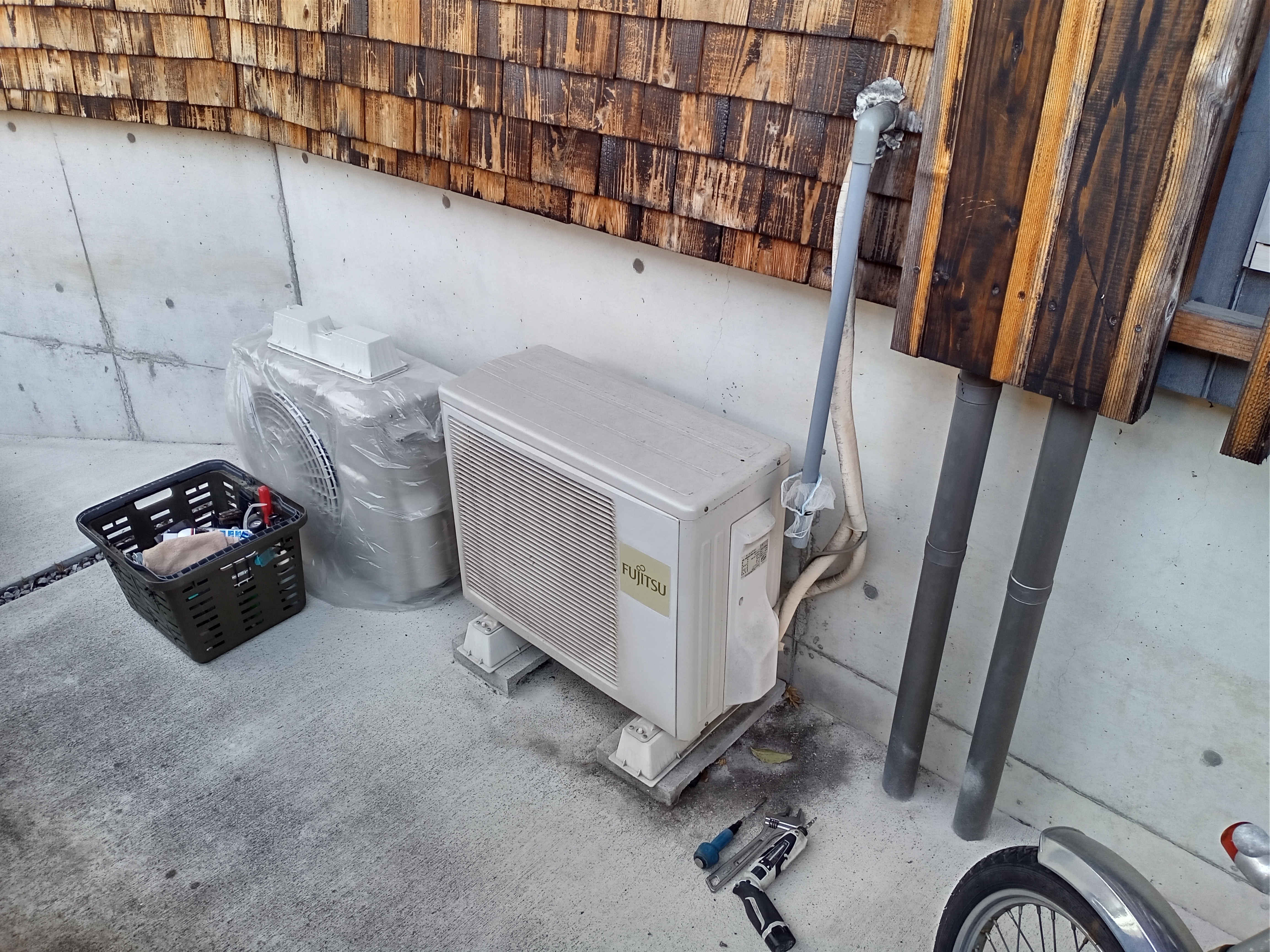 室外の配管を整えてテープを巻き直し室外機設置。