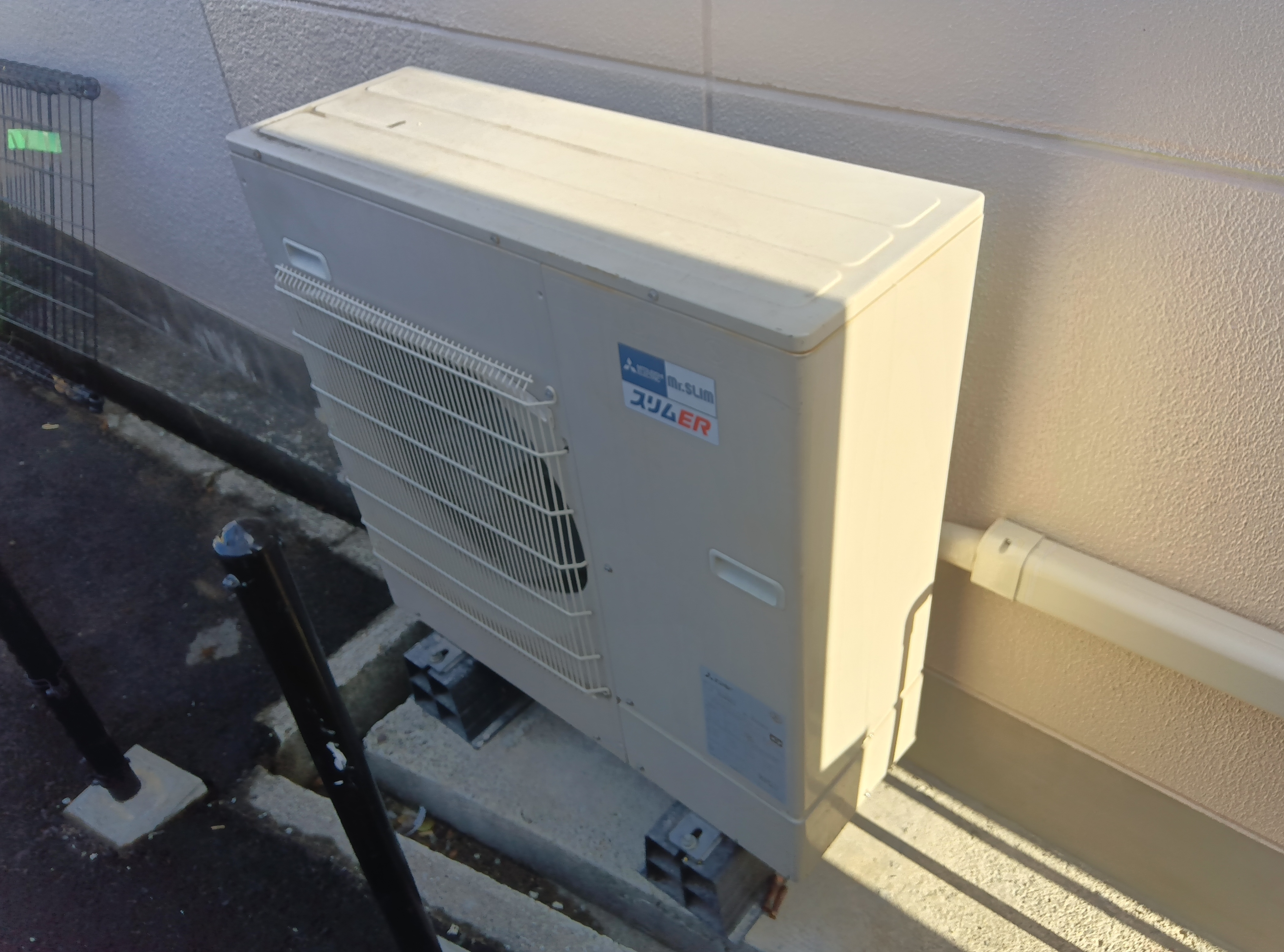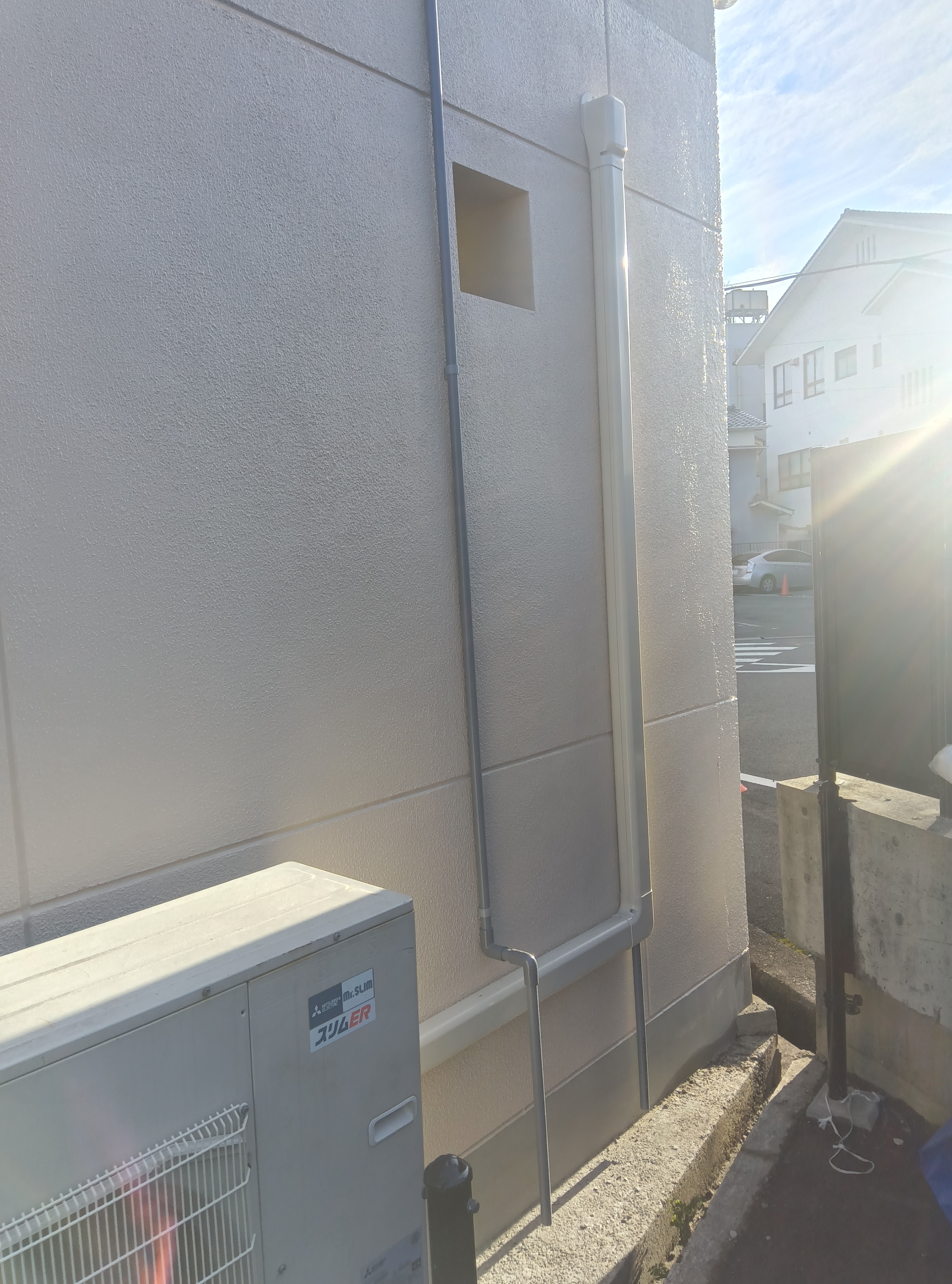 業務用壁掛け形エアコンは室内機取り外し・室内配管カバー更新・外部配管カバー更新・配管盛替えを実施。